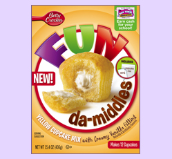 Fun Da-Middles combines cake mix and filling pouch in one box. Fun da-middles have a special creamy filling that bakes inside the cupcakes. Fun Da-Middles is available in three delicious flavors, Vanilla Cake with Creamy Chocolate Filling, Chocolate Cake with Creamy Vanilla Filling, and Vanilla Cake with Creamy Vanilla Filling. With Fun da-middles, you’ll never need to frost cupcakes again. Because after all, it’s what’s on the inside that matters.