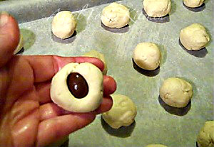 - Push 1 chocolate almond into each ball, making sure the chocolate is completely covered.