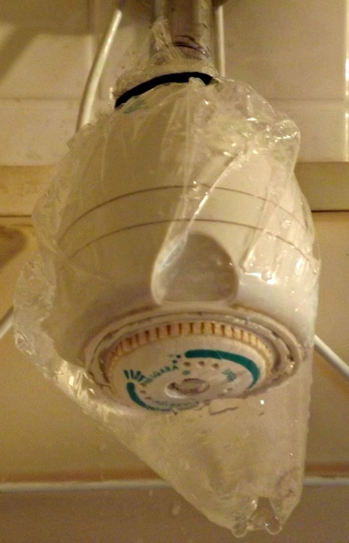 Here is a picture of my shower head during the vinegar treatment. As you can see it really needed it.