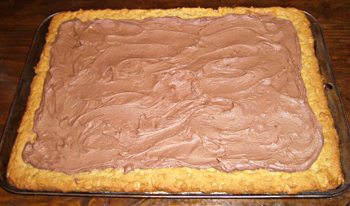 - Once cooled, frost with chocolate frosting (recipe follows) and cut into bars to serve.