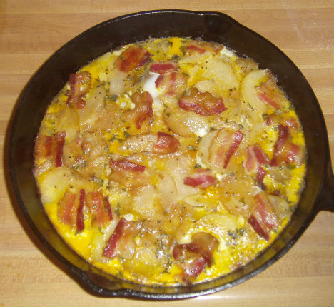 Place the cooked potatoes into the pan. Pour the egg mixture evenly over the potatoes.